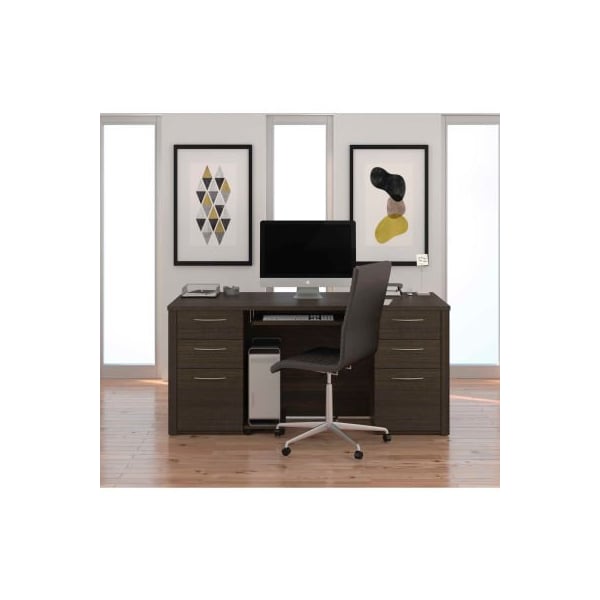 Bestar executive desk kit - 66" - dark chocolate - embassy series embassy offers numerous configuration possibilities for various uses. Offering smaller desks, this collection is ideal for every type of workplace including the home office. The desk is made of a durable 1" commercial grade work surface with melamine finish that resist scratches, stains and wear. It features an impact resistant thick pvc edge, a full modesty panel and classic moldings. Grommets are available on the desk for efficient wire management. The desk shell meets or exceeds ansi/bifma performance standards. Each pedestal offer two utility drawers and one file drawer with letter/legal filing system. One lock secures bottom two drawers. The drawers and the keyboard shelf have double extension ball-bearing slides for a smooth and quiet operation.