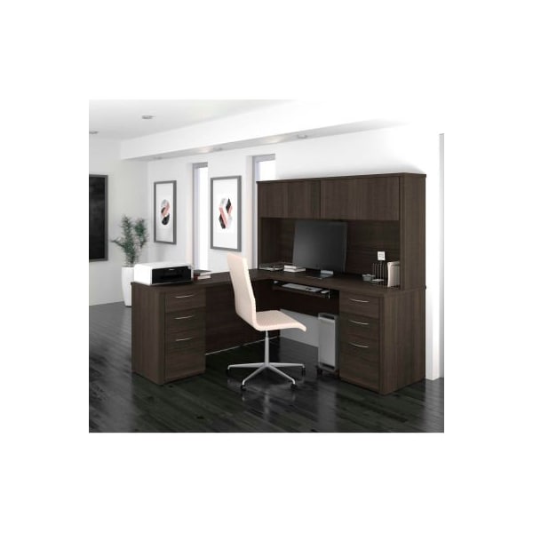 Bestar l-shaped desk with hutch - 71" - dark chocolate - embassy series embassy offers numerous configuration possibilities for various uses. Offering smaller desks, this collection is ideal for every type of workplace including the home office. The desk is made of a durable 1" commercial grade work surface with melamine finish that resist scratches, stains and wear. It features an impact resistant thick pvc edge and classic moldings. Grommets and a rubber strip are available on the station for efficient wire management. The credenza, the return table and the hutch meet or exceed ansi/bifma performance standards. The hutch for credenza offers a large closed storage space. The opening has 11'' 3/4 high which is ideal for letter format binders. The doors are fitted with strong adjustable hinges. Each pedestal offer two utility drawers and one file drawer with letter/legal filing system. One lock secures bottom two drawers. The drawers and the keyboard shelf have double extension ball-bearing slides for a smooth and quiet operation. The station is fully reversible.