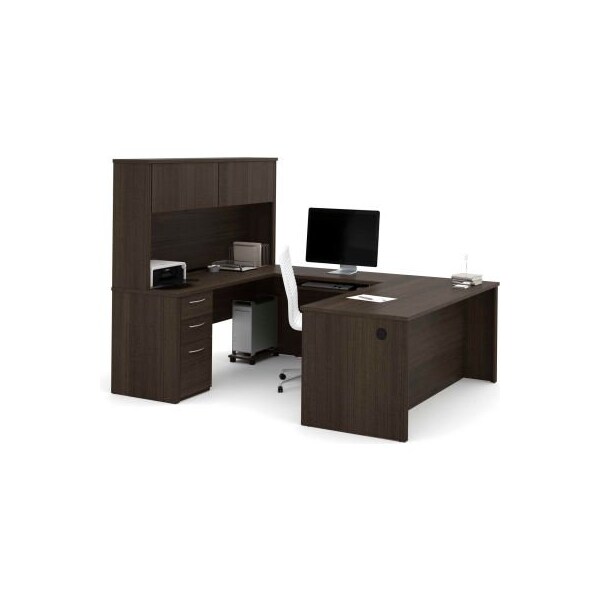 Bestar u-shaped desk - 71" - dark chocolate - embassy series embassy offers numerous configuration possibilities for various uses. Offering smaller desks, this collection is ideal for every type of workplace including the home office. The desk is made of a durable 1" commercial grade work surface with melamine finish that resist scratches, stains and wear. It features an impact resistant thick pvc edge and classic moldings. Grommets and a rubber strip are available on the station for efficient wire management. The credenza, the return, the executive desk and the hutch meet or exceed ansi/bifma performance standards. The hutch for credenza offers a large closed storage space. The opening has 11'' 3/4 high which is ideal for letter format binders. The doors are fitted with strong adjustable hinges. The pedestal offers two utility drawers and one file drawer with letter/legal filing system. One lock secures bottom two drawers. The drawers and the keyboard shelf are on ball-bearing slides for a smooth and quiet operation. The station is fully reversible.