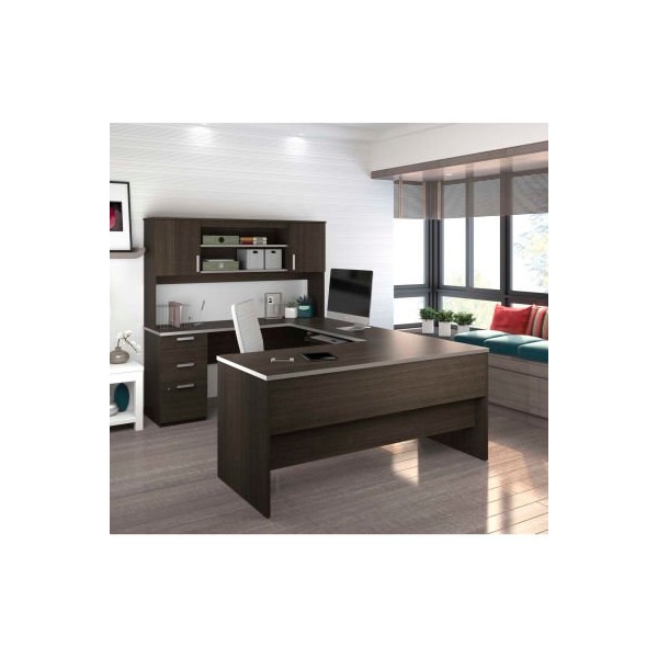 Bestar u-shaped desk - dark chocolate - ridgeley series add a touch of contemporary and style to your work area with the ridgeley desk. The desk features durable 1" commercial grade work surfaces with melamine finish that resist scratches, stains and wear. The pedestal features one utility drawer, one door and one file drawer with letter/legal filing system. Drawers and keyboard shelf are mounted on ball-bearing slides for smooth and quiet operation. One lock secure the file drawer. The edge and the handles feature a brushed nickel finish. The contemporary metal handle offers geometric lines and an uncluttered design. The hutch has two doors and 2 adjustbale shelves that allow closed and open storage. Fully reversible unit. Easy to assemble.