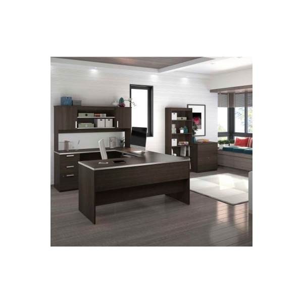 Bestar u-shaped desk with lateral file and bookcase - dark chocolate - ridgeley series add a touch of contemporary and style to your work area with the ridgeley 3-piece set. The desk features durable 1" commercial grade work surfaces with melamine finish that resist scratches, stains and wear. The pedestal features one utility drawer, one door and one file drawer with letter/legal filing system. One lock secure the file drawer. The edge and the handles feature a brushed nickel finish. The contemporary metal handle offers geometric lines and an uncluttered design. The hutch has two doors and 2 adjustbale shelves that allow closed and open storage. Fully reversible unit. The lateral file has two file drawers with letter/legal filing system and one lock that secures both drawers. All the drawers of this set and the keyboard shelf are mounted on ball-bearing slides for smooth and quiet operation. The bookcase features 5 shelves, three of which are adjustable. Desk: 65" x 93.6" x 65.9". Bookcase: 29.5" x 11.6" x 72". Lateral file: 28.4" x 19.6" x 30.4". Easy to assemble.