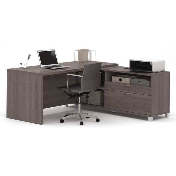 L-Shaped Office Desk, Caster/Glide Diameter Not Applicable, Caster/Glide Type Not Applicable, Desktop Color Bark Grey, Desktop Material Particle Board, Frame Color Bark Grey, Frame Material Particle Board, Includes Client Surface Yes, Includes Keyboard Tray No, Includes Modesty Panel Yes, Number of Cable Holes 0, Number of Casters/Glides 0, Number of Drawers 2, Number of Pedestals 0, Number of Shelves 1, Overall Depth 71 1/8 in, Overall Height 29 7/8 in, Overall Width 71 1/8 in