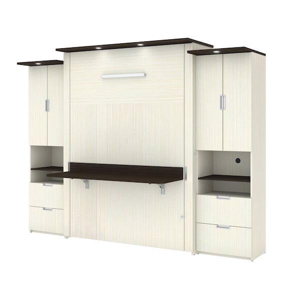 Lumina Queen Murphy Bed with Desk and 2 Storage Cabinets (113W), White Chocolate