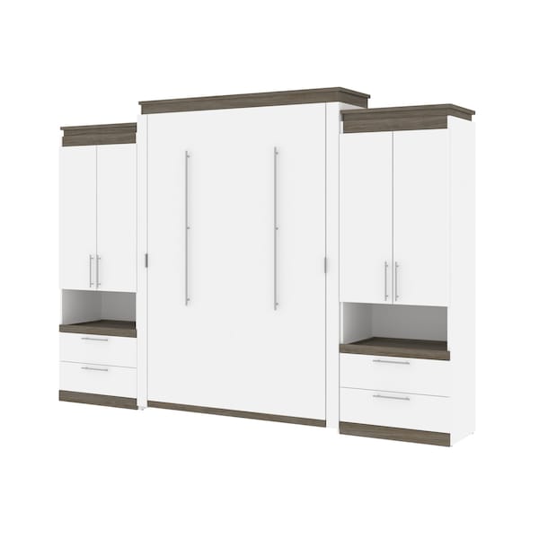 Orion 124W Queen Murphy Bed and 2 Storage Cabinets with Pull-Out Shelves (125W), White & Walnut Grey