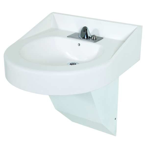 Lavatory Sink, Material of Construction Phenolic ResinOverall Length (In.) 19-7/8Overall Height (In.) 22-1/2, Number of Stations 1, Bowl Single, Bowl Size (In.) 15, Back Splash 3 In., Side Splash 3 In., Mounting Type Wall, Faucet Mounting Centers (In.) 4, Number of Holes 3, Drain Opening (In.) 1-5/16, Color/Finish White, ADA Compliant Yes, Includes Single Temp Antiligature Faucet, S Clip and Angle Brackets