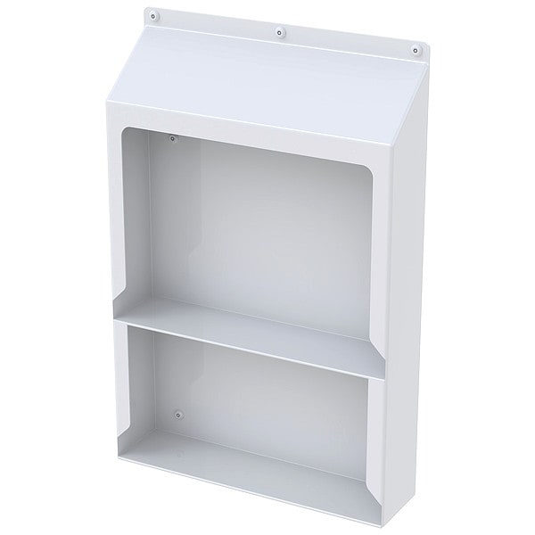 Utility Shelf, Product Type Vanity Shelf, Mounting Type Recessed, Overall Height 18 1/8 in, Overall Width 12 in, Overall Depth 3 in, Material Stainless Steel, Finish Powder Coated, Weight Capacity Not Applicable, Center to Center Hole Distance 9 in, ADA Compliant No, Includes Mounting Hardware Yes, Color White, Includes (4) Screws, Resistance Properties Ligature Resistant