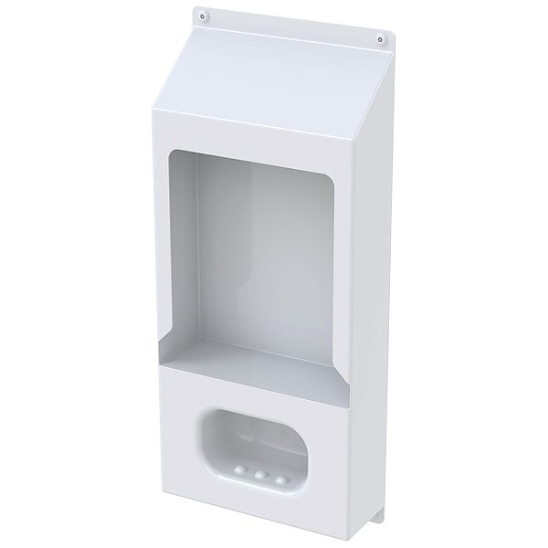 Utility Shelf, Product Type Shower Caddy, Mounting Type Exposed, Overall Height 18 3/4 in, Overall Width 8 in, Overall Depth 3 in, Material Stainless Steel, Finish Powder Coated, Weight Capacity Not Applicable, Center to Center Hole Distance 7 in, ADA Compliant No, Includes Mounting Hardware Yes, Color White, Features Open Vertical Shelf Design with Sloping Top, Die Formed Soap Dish with Raised Dimples, Includes (4) Screws, Resistance Properties Ligature Resistant