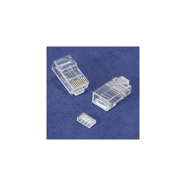 These RJ45 plugs allow you to complete your cable termination. The modular plug has gold plating on the contacts for a more reliable connection and protection against corrosion and aging. 3 piece connector type. Includes inserter. Cable Plug Type: Solid Shielding: No Category: Cat6 # of Prongs: 3 # of Microns: 50 Qty: 100