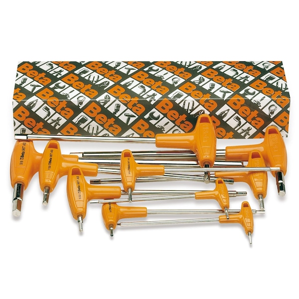 Designed and manufactured in Italy, the 96T series of t-handle hex key wrenches feature a chrome-plated round bar molded into a hard plastic handle for industrial strength and durability. The ergonomic handle provides a comfort grip while delivering high torque. The same size SAE (fractional inch) hex is on the extended leg and short leg of the handle, with a hole on one end for hanging on a hook or attaching a lanyard. The size of each wrench is printed in bold black numbers on the handle for easy identification. This 10-piece set includes SAE (fractional inch) sizes 3/32, 7/64, 1/8, 9/64, 5/32, 3/16, 7/32, 1/4, 5/16, 3/8.