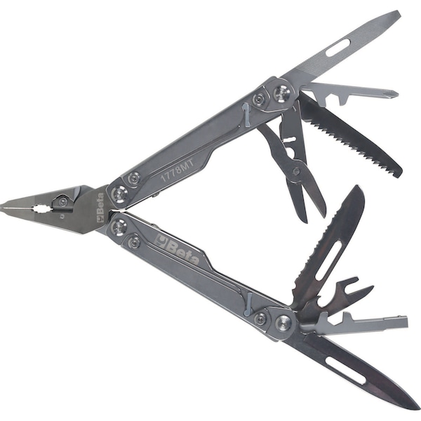 Beta's 1778MT multi-tool include 11 bits, for Phillips, Torx, Pozidriv, hexagon and slotted head screws, making this item ideal for any work environment as well as camping, hunting and DIY. The four levers on the handle allow accessories to be pulled out from any position, and the two lock/unlock buttons provide unparalleled safety for users. Tools include: Combination pliers, Large knife blade, Serrated blade, hacksaw blade, file, Tin/Bottle Opener, Scissors, 4 Ruler, Screwdriver with 11 bits.