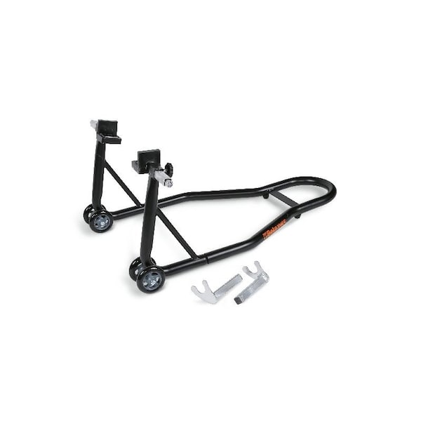 3040C, Adjustable Rear wheel Motorcycle Stand. Matte black lacquer finish, 4 thermoplastic rubber wheels, Includes 2 V-shaped sliders (3040C/S1) & 2 L-shaped sliders (3040C/S2).