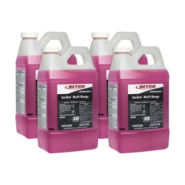 EPA-approved, broad-range sanitizer delivers correct sanitizing at a range of 150 to 400 ppm. That allows the sanitizing solution to adapt to varying water-pressure situations while maintaining compliance with health department regulations. Multi-Range Sanibet kills 99.99 percent of foodservice organisms listeria, E. coli and salmonella. It can be used to sanitize serving ware, utensils, pots and pans, and food-processing equipment. It can also be used for disinfecting floors and walls. This complete, chemically balanced deodorizer/disinfectant/sanitizer is effective even in the presence of hard water. As part of the FastDraw system, the highly concentrated sanitizer in a spill-proof bottle is numbered FastDraw 18 and color-coded to eliminate misuse. Metering insert reduces end-use cost per gallon by delivering accurate dilutions.