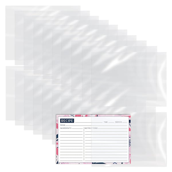 Protect your treasured recipe cards with crystal clear plastic covers that fit standard 4in. x 6in. recipe card boxes. Skim through your recipes knowing that they are safeguarded against finger smudges, kitchen messes, spills and dust. A bulk pack of 200 covers means you will have plenty to store the recipes card you've acquired over the years.