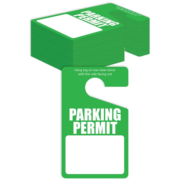 Bulk pack of 50 green 0.2in. thick non-PVC poly plastic 3in. x 5in. temporary parking permit hang tags for vehicle rearview mirrors. Blank areas on cards accommodate customization.