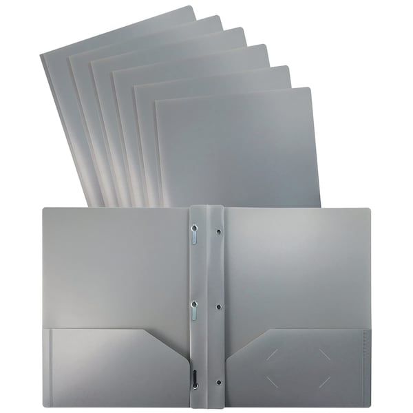 Durable, 2-Pocket GRAY Poly Folders with prongs/fasteners can be used for term papers, essays, reports, and presentations. Two interior pockets provide storage for additional paper.