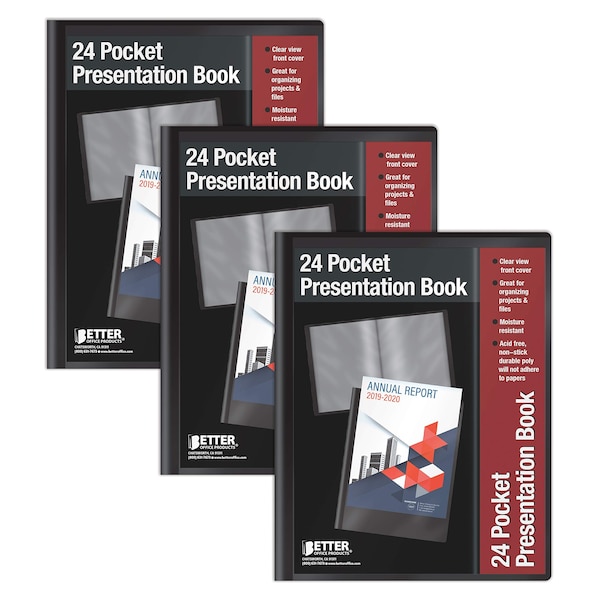 24 Pocket Bound Sheet Protector Presentation Book, 3 Pack, Clear View Front, 48 Page Capacity, by Better Office Products, Art Portfolio, Durable Black Poly Front and Back Covers, Letter Size