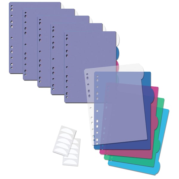 5-Tab poly index dividers are handy when you need to organize and catalog papers, documents, and other collectibles in a 3-ring binder. Use the white adhesive labels included or write directly on the tabs with a permanent marking pen to customize. Each of the 5 sheets is a different color clear, blue, fuchsia, lime, teal with matching tab...great for color-coding your files. Suitable for school, office, or home.