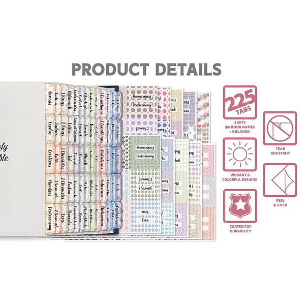 Permanent adhesive Christian bible index tabs are a convenient way to mark the beginning of each book of one's bible. The 225-piece pack includes THREE full sets. Each set has 66 preprinted book titles 39 books of the most common Protestant Old Testament canons plus 27 New Testament book titles and 9 blank tabs for customizing with additional canons or use the tabs for personalizing your bible. Laminated paper tabs are tear-resistant and spill-resistant. Black lettering in an attractive and easy to read font adds a beautiful touch to your index tabs.