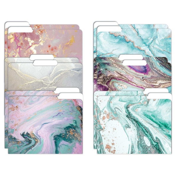 MARBLED Fashion File Folders by Better Office Products. Six attractive designs on heavyweight, 300 gsm paper with a clear-coated finish for added durability and sheen. 1/3-Cut tabs allow a sizable amount of space for customizing the tabs. Use in the office or at home to brighten your work space and personalize your project folders.