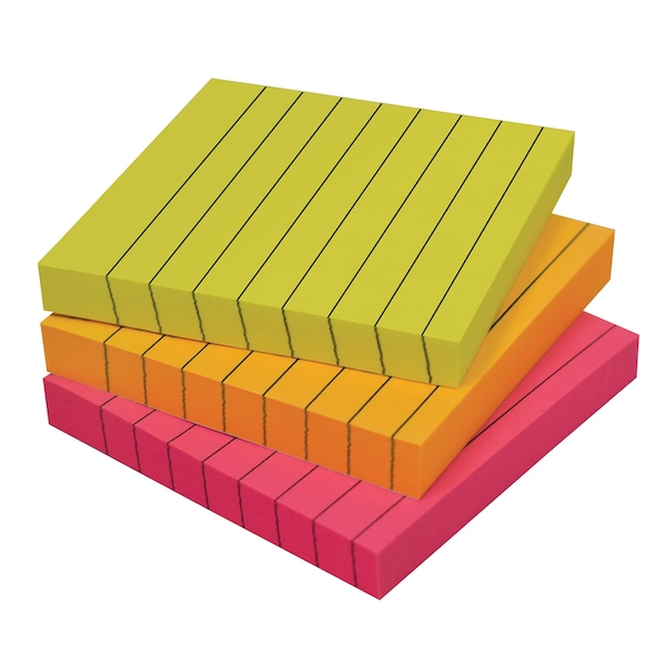 Better Office Products 3 x 3-inch Lined Sticky Notes in bright colors come in a variety of pack sizes of 100-sheet-pads to suit your needs. Quality paper and strong adhesive allow notes to stick to any flat, smooth surface with no curling. Easily remove and reapply elsewhere. The adhesive will lift away cleanly.