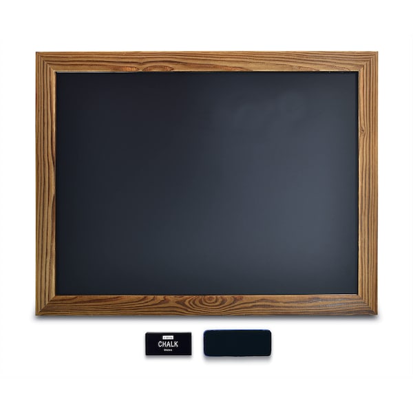 Rustic real wood pine framed chalkboard with a 15in. x 21in. magnetic surface. Measures 18in. x 24in. frame edge to frame edge with a built-in metal hardware in the backside of the frame to allow vertical or horizontal mounting. Includes mounting hardware and mini level. Comes with white chalk and a chalk eraser. Easy to clean.