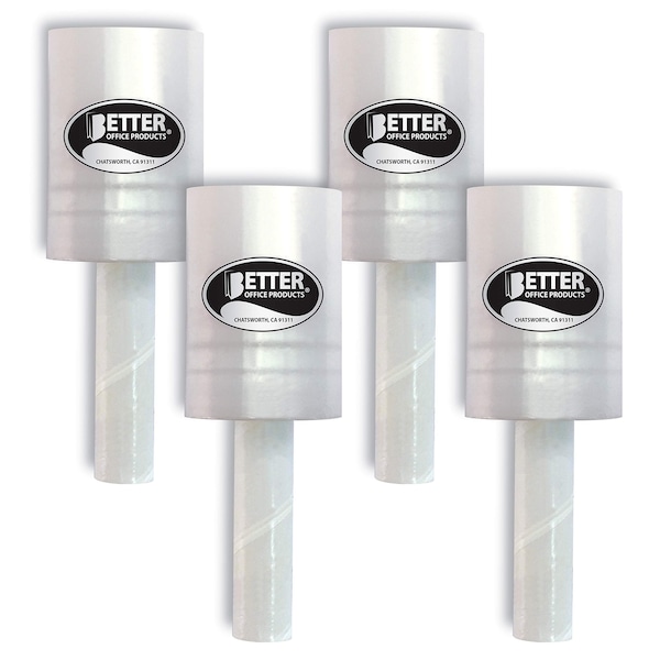 Better Office Products 4-PACK industrial mini stretch wrap contains two rolls of 80 gauge wrap that is 5in. wide by 1,000 feet long. 80 gauge is twice as thick as standard wrap, and each roll is wound onto a 10in. long heavy duty compressed paper core leaving a 5in. long integrated handle. With a handle diameter of 1-3/16in., you get a firmer grip and a more comfortable wrapping experience. Compare Better Office Products mini stretch wrap handle to the industry's standard chunky handle that's 0.5in. larger 1-11/16in. and 13% heavier for the same amount of film. One half-inch less in diameter and means less hand strain. Whether you're securing items for a move or for shipping purposes, time, efficiency, comfort, and ease of use matter. Great for office, home, industrial, moving and shipping use. Each roll weighs 1.63 lbs. and measures 3.75in. diameter x 10.25in. high with a 5in. long handle.