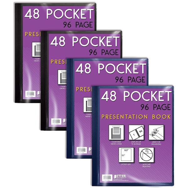 48 Pocket Bound Presentation Book, Assorted Colors, Clear View Front Cover, 96 Sheet Protector Pages, 8.5" x 11" Sheets, by Better Office Products, Art Portfolio, Poly Covers, Letter Size (4 Pack)