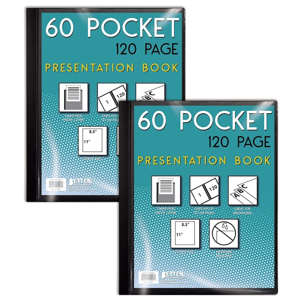 60 Pocket Bound Black Presentation Book, with Clear View Front Cover, 120 Sheet Protector Pages, 8.5" x 11" Sheets, by Better Office Products, Art Portfolio, Durable Poly Covers, Letter Size (2 Pack)