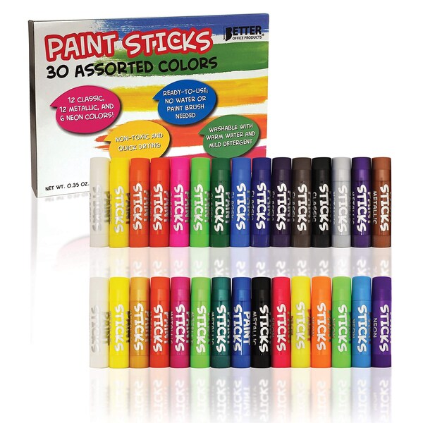 Better Office Products' Paint Sticks come in a set of 30 vibrant and fun colors including classic, metallic, and neon that are ready to use. With no water or brushes needed, Paint Sticks are less messy than traditional tempera paints. The solid paints go on smoothly with even coverage that won't crack. Paints are encased in plastic tubes. Simply remove cap, twist bottom base to expose paint stick to desired height, and apply to your choice of paper, poster board, wood, glass, windows, and more.