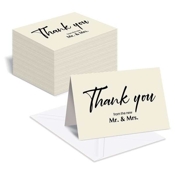 4in. x 6in. bulk thank you cards featuring THANK YOU FROM THE NEW MR. & MRS. The set includes 120 cards and 120 white envelopes. Cards are made of 90 lb. cover stock for a high-quality look and feel. Envelopes are white 32 lb. offset paper.