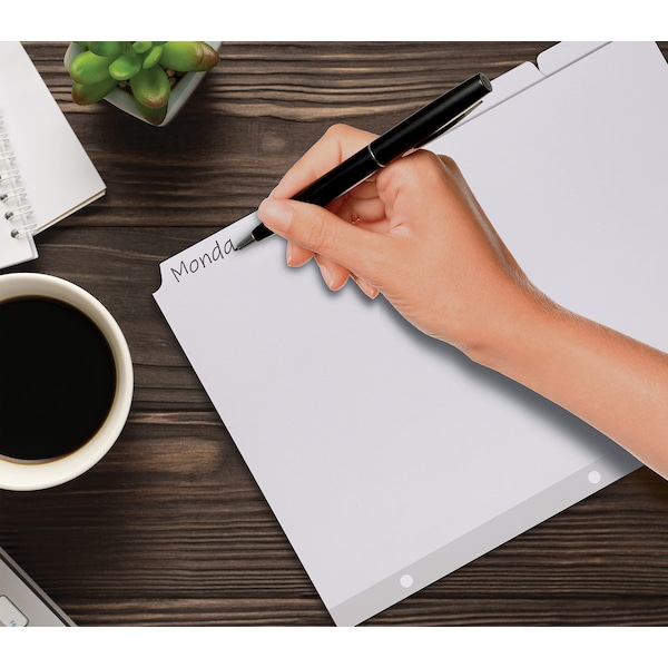 5 Write-on tab binder index dividers are handy when you need to organize and catalog papers, documents, and other collectible and organizable items. Write directly on the reinforced laminated tabs to customize. Use pencil if you wish to erase marks at some point or pen for permanent marks. Off-white in color and reusable. Great for school, office, or home.