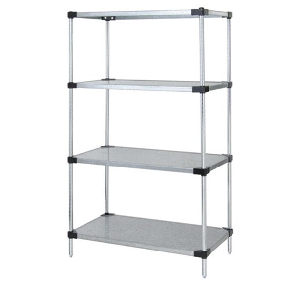 Solid shelves are a solution where dirt dust and spills are a potential issue. The solid flat surface allows for storage from small to large items and the marine edge perimeter prevents spillage. The double hemmed steel gives the solid shelf excellent strength characteristics. All solid shelf units consist of 4 shelves and 4 posts. Solid shelves are a solution where dirt dust and spills are a potential issue. The solid flat surface allows for storage from small to large items and the marine edge perimeter prevents spillage. The double hemmed 18 gauge galvanized steel gives the solid shelf excellent strength characteristics. All solid shelf units consist of 4 shelves and 4 posts. Features -Finish - Galvanized Steel -Load - 600 lbs. -Outer Dimension - 14 x 48 x 54 in.