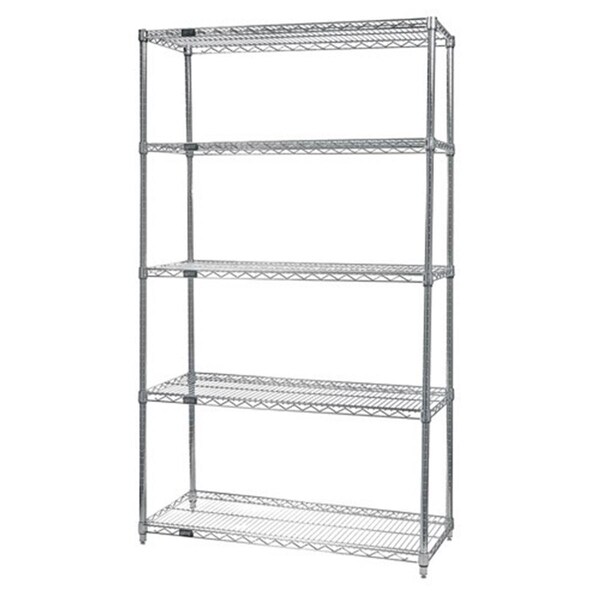 This chrome wire shelving starter kit is made up of four chrome posts and five chrome shelves. These wire shelving units are perfect in a dry storage environment. Features -Wire Shelves are all welded construction with additional wire trussing for high strength characteristics. -Wire allows air to circulate and light to penetrate for increased product visibility and minimal dirt accumulation. -Split conical sleeve adaptors secure shelf corner to post. -Numbered grooved posts on 1 in. increments for quick assembly. -Finish - Chrome -Load - 800 lbs. -Outer Dimension - 14 x 42 x 63 in.