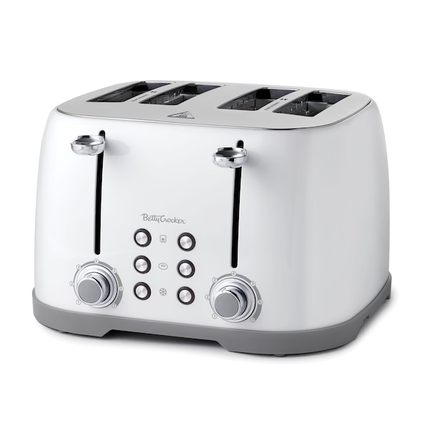 Not your ordinary 4 slot toaster! Betty Crockers deluxe four slice toaster makes more than just toast. We offer a multifunctional slot toaster for sliced toast, thick bagels, delicious Belgian waffles and more of your favorite toastable pastries. Choose between 2 or 4 slices at once with separate controls. This electric toaster features 2 shader control dials, 2 sets of 3 illuminated buttons, 2 slide-down levers and even 2 slide-out crumb trays for each toaster compartment. Our delightful compact retro toaster has 6 Illuminated buttons that light up when pressed to let you know they're on and working. Illuminated buttons include a bagel button designed for perfectly toasted bagels, defrost button for toasting frozen or cold bread and a cancel button that automatically stops toasting and lifts the slotted bread. Two separate traditional push-down tabs turn each set of toaster slots on and off for heating up either 2 or 4 slices of toast at the same time. The extra-lift feature provides added lift of the slots to easily grab your contents. Cute toaster design with Brushed metallic finish is easy to clean while maintaining a wonderful shine that works well in any kitchen. Slotted toaster also features 2 bread centering guides in each slot and adjustable shade dials with electronic shade sensor control & 7 settings. 1600 watts. Our bread toasters 4 slice comes with 2 slide-out crumb trays for easy removal of leftover crumbs. Pop up and welcome your new favorite kitchen appliance! Our Betty Crocker kitchen appliance makes a perfect toast to any new home, dorm room, apartment and living space with limited countertop space.
