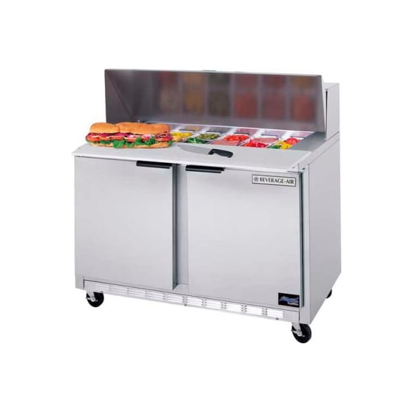 Spe48 elite series - cutting top larger 17" wide cutting board prep table. Features enhanced refrigeration system and new and improved grille system for better airflow and less temperature gradient. Improved design provides better airflow management and uniform temperature distribution throughout the cabinet. Pans are cooled from the bottom, eliminating the necessity of air blanket. Airflow assures that product in open containers is kept below 41f and above freezing. This translates into increased product shelf life, higher quality food, better food appearance, fresher product and a reduction of bacteria buildup to combat food-borne illnesses. Cabinet construction exterior construction includes heavy-duty stainless steel finish on front, sides, top, door(s) and grille. Removable hoods and insulated lid assemblies are made of matching stainless steel. Cabinet back and bottom are constructed of galvanized steel. Interior liner is made of anodized aluminum for superior resistance to corrosion. Doors are mounted to face of cabinet on cartridge style hinges permitting them to self close under their own weight. Hinges also allow doors to stay open 120 and permit easy door removal for service and cleaning if required. A plug in type vinyl magnetic gasket is attached to each door for positive seal. Door handle is made from extruded aluminum with a black anodized finish. It is contoured to permit easy opening of doors with fingers from both top and bottom of handle. Cabinet insulation is cfc free foamed-in-place polyurethane of two-inch minimum thickness. Six-inch casters, 2 with brakes, are standard. Legs are available as an option. Cutting board supplied with cabinet is 17" wide constructed of highdensity white polyethylene plastic. It is readily removable for cleaning. Two epoxy-coated steel wire shelves are supplied as standard. Pans furnished are 4" deep and made of polycarbonate plastic. Refrigeration more robust refrigeration system provides a