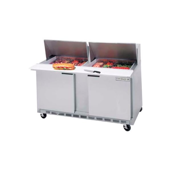 Spe60 elite series - mega top fifty percent greater pan capacity than the all around standard prep table. Features enhanced refrigeration system. Improved airflow and less temperature gradient inside the cabinet. Better airflow management and uniform temperature distribution throughout the cabinet. Pans are cooled from the bottom, eliminating the necessity of air blanket. Airflow assures that product in open containers is kept below 41f and above freezing. This translates into increased product shelf life, higher quality food, better food appearance, fresher product and a reduction of bacteria build-up to combat food-borne illnesses. Cabinet construction exterior construction includes heavy-duty stainless steel finish on front, sides, top, door(s) and grille. Removable hoods and insulated lid assemblies are made of matching stainless steel. Cabinet back and bottom are constructed of galvanized steel. Interior liner is made of anodized aluminum for superior resistance to corrosion. Doors are mounted to face of cabinet on cartridge style hinges permitting them to self close under their own weight. Hinges also allow doors to stay open 120 and permit easy door removal for service and cleaning if required. A plug in type vinyl magnetic gasket is attached to each door for positive seal. Door handle is made from extruded aluminum with a black anodized finish. It is contoured to permit easy opening of doors with fingers from both top and bottom of handle. Cabinet insulation is cfc free foamed-in-place polyurethane of two-inch minimum thickness. Six-inch casters, 2 with brakes, are standard. Legs are available as an option. Cutting board supplied with cabinet is 10" wide constructed of highdensity white polyethylene plastic. It is readily removable for cleaning. Two epoxy-coated steel wire shelves per section are supplied as standard. Pans furnished are 4" deep and made of polycarbonate plastic. Refrigeration more robust refrigeration system provides adde