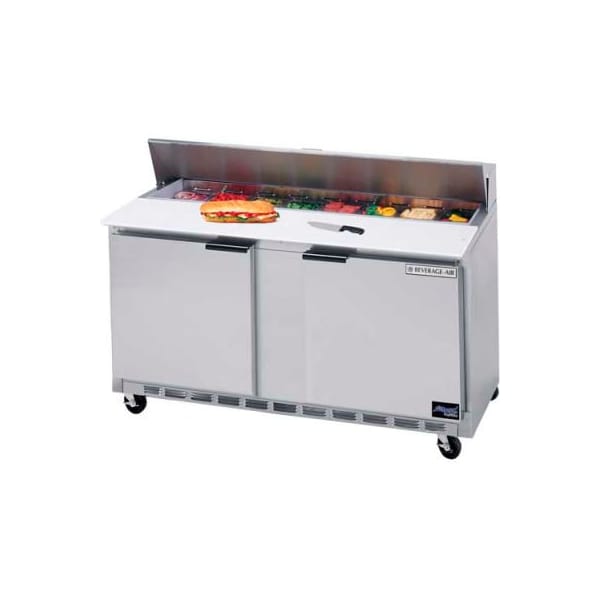 Spe60 elite series - standard top all around prep table with enhanced refrigeration system. Improved airflow and less temperature gradient inside the cabinet. Better airflow management and uniform temperature distribution throughout the cabinet. Pans are cooled from the bottom, eliminating the necessity of air blanket. Airflow assures that product in open containers is kept below 41f and above freezing. This translates into increased product shelf life, higher quality food, better food appearance, fresher product and a reduction of bacteria build-up to combat food-borne illnesses. Cabinet construction exterior construction includes heavy-duty stainless steel finish on front, sides, top, door(s) and grille. Removable hoods and insulated lid assemblies are made of matching stainless steel. Cabinet back and bottom are constructed of galvanized steel. Interior liner is made of anodized aluminum for superior resistance to corrosion. Doors are mounted to face of cabinet on cartridge style hinges permitting them to self close under their own weight. Hinges also allow doors to stay open 120 and permit easy door removal for service and cleaning if required. A plug in type vinyl magnetic gasket is attached to each door for positive seal. Door handle is made from extruded aluminum with a black anodized finish. It is contoured to permit easy opening of doors with fingers from both top and bottom of handle. Cabinet insulation is cfc free foamed-in-place polyurethane of two-inch minimum thickness. Six-inch casters, 2 with brakes, are standard. Legs are available as an option. Cutting board supplied with cabinet is 10" wide constructed of highdensity white polyethylene plastic. It is readily removable for cleaning. Two epoxy-coated steel wire shelves per section are supplied as standard. Pans furnished are 4" deep and made of polycarbonate plastic. Refrigeration more robust refrigeration system provides added capacity and efficiency. Systems are designed using