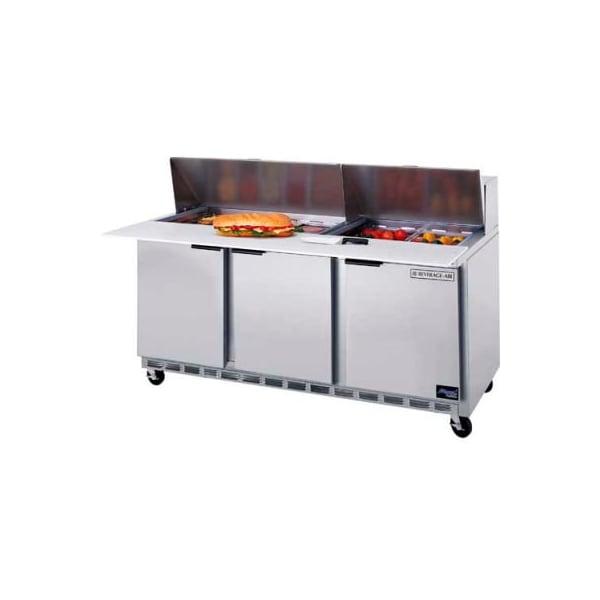 Spe72 elite series - cutting top larger 17" wide cutting board prep table. Features enhanced refrigeration system. Improved airflow and less temperature gradient inside the cabinet. Better airflow management and uniform temperature distribution throughout the cabinet. Pans are cooled from the bottom, eliminating the necessity of air blanket. Airflow assures that product in open containers is kept below 41f and above freezing. This translates into increased product shelf life, higher quality food, better food appearance, fresher product and a reduction of bacteria build-up to combat food-borne illnesses. Cabinet construction exterior construction includes heavy-duty stainless steel finish on front, sides, top, door(s) and grille. Removable hoods and insulated lid assemblies are made of matching stainless steel. Cabinet back and bottom are constructed of galvanized steel. Interior liner is made of anodized aluminum for superior resistance to corrosion. Doors are mounted to face of cabinet on cartridge style hinges permitting them to self close under their own weight. Hinges also allow doors to stay open 120 and permit easy door removal for service and cleaning if required. A plug in type vinyl magnetic gasket is attached to each door for positive seal. Door handle is made from extruded aluminum with a black anodized finish. It is contoured to permit easy opening of doors with fingers from both top and bottom of handle. Cabinet insulation is cfc free foamed-in-place polyurethane of two-inch minimum thickness. Six-inch casters, 2 with brakes, are standard. Legs are available as an option. Cutting board supplied with cabinet is 17" wide constructed of highdensity white polyethylene plastic. It is readily removable for cleaning. Two epoxy-coated steel wire shelves are supplied as standard. Pans furnished are 4" deep and made of polycarbonate plastic. Refrigeration more robust refrigeration system provides added capacity and efficiency. Systems are