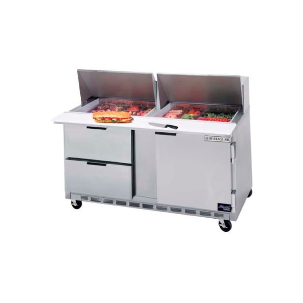 Sped60 elite series - mega top with drawers fifty percent greater pan capacity than the all-around standard prep table. Features enhanced refrigeration system. Improved airflow for less temperature gradient and uniform temperature distribution throughout the cabinet. Pans are cooled from the bottom, eliminating the necessity of air blanket. Airflow assures that product in open containers is kept below 41f and above freezing. This translates into increased product shelf life, higher quality food, better food appearance, fresher product and a reduction of bacteria build-up to combat food-borne illnesses. Cabinet construction exterior construction includes heavy-duty stainless steel finish on front, sides, top, drawers and grille. Removable hoods and insulated lid assemblies are made of matching stainless steel. Cabinet back and bottom are constructed of galvanized steel. Interior liner is made of anodized aluminum for superior resistance to corrosion. In cabinets with doors and drawers, doors are mounted to face of cabinet on cartridge-style hinges permitting them to self close under their own weight. Hinges also allow doors to stay open 120 and permit easy door removal for service and cleaning if required. A plug-in type vinyl magnetic gasket is attached to each door for positive seal. Drawer frames are constructed of heavy-duty stainless steel and are supported on heavy-duty telescoping drawer slides for maximum support of stored food products. The drawer slides have a locking mechanism that prevents the drawers from being inadvertently pulled off the cabinets. Upper pull-out drawers accommodate 6" deep pans. Lower pull-out drawers accommodate two 4" deep pans. Heavy-duty pan divider supports are supplied. Foodservice pans for drawers are not included. Snap-type vinyl magnetic gasket is attached to each drawer for positive seal. Top drawer extends 17 3/4" (when opened) and bottom drawer extends 15 3/4" (when opened). Cabinet insulation