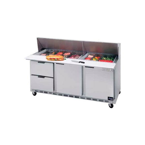 Sped72 elite series - mega top with drawers fifty percent greater pan capacity than the all-around standard prep table. Features enhanced refrigeration system. Improved airflow for less temperature gradient and uniform temperature distribution throughout the cabinet. Pans are cooled from the bottom, eliminating the necessity of air blanket. Airflow assures that product in open containers is kept below 41f and above freezing. This translates into increased product shelf life, higher quality food, better food appearance, fresher product and a reduction of bacteria build-up to combat food-borne illnesses. Cabinet construction exterior construction includes heavy-duty stainless steel finish on front, sides, top, drawers and grille. Removable hoods and insulated lid assemblies are made of matching stainless steel. Cabinet back and bottom are constructed of galvanized steel. Interior liner is made of anodized aluminum for superior resistance to corrosion. In cabinets with doors and drawers, doors are mounted to face of cabinet on cartridge-style hinges permitting them to self close under their own weight. Hinges also allow doors to stay open 120 and permit easy door removal for service and cleaning if required. A plug-in type vinyl magnetic gasket is attached to each door for positive seal. Drawer frames are constructed of heavy-duty stainless steel and are supported on heavy-duty telescoping drawer slides for maximum support of stored food products. The drawer slides have a locking mechanism that prevents the drawers from being inadvertently pulled off the cabinets. Upper pull-out drawers accommodate 6" deep pans. Lower pull-out drawers accommodate two 4" deep pans. Heavy-duty pan divider supports are supplied. Foodservice pans for drawers are not included. Snap-type vinyl magnetic gasket is attached to each drawer for positive seal. Top drawer extends 17 3/4" (when opened) and bottom drawer extends 15 3/4" (when opened). Cabinet insulation