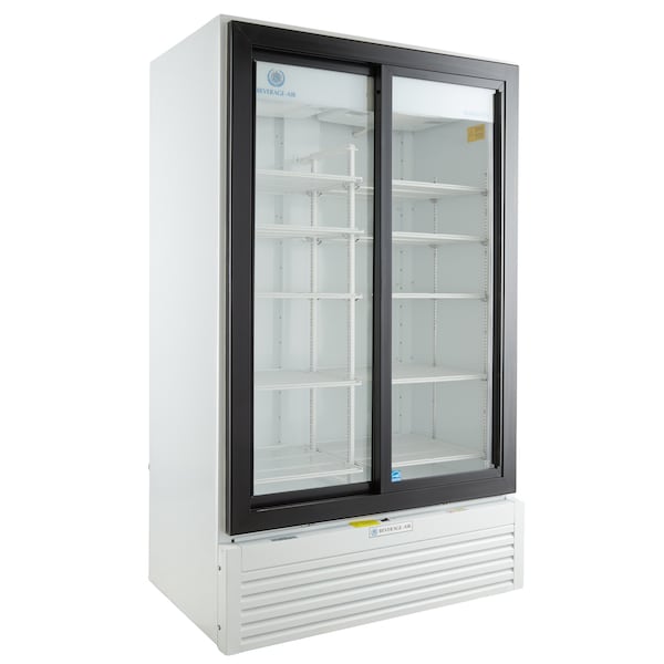 Refrigerated Merchandiser, Reach-in, Two Section, (2) Double Pane Black Framed Sliding Glass Doors, 29.41 cu. ft. Capacity, Electronic Temperature Control, (10) Adjustable Wire Shelves, LED Interior Lighting, Self-closing Door with Recessed Pocket Door Handle, Bottom Mounted Refrigeration, White Interior & Exterior, R290 Hydrocarbon Refrigerant, 1/2 HP Compressor, ETL, cETLus, ENERGY STAR