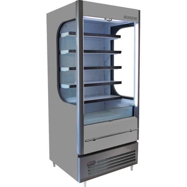 Open Air Merchandiser, 34-4/5"W x 31-2/3"D x 78-4/5" H, 15.45 cu. ft. Capacity, Glass Ssides, (5) Shelves, Night Curtain, 36° F - 40° F Operating Temperatures, LED Interior Lighting, Maintenance Free Condenser, Gray Painted Exterior, 6" Adjustable Legs, (2) 1/4 HP Compressors, cETLus, ETL-Sanitation
