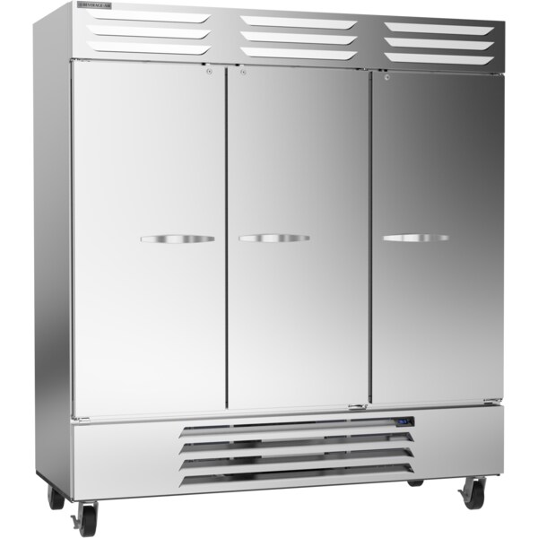 Refrigerator, Reach-in, Three Section, 68.93 cu. ft.,Electronic Control, (3) Lockable Hinged Self Closing Solid Doors, (9) Wire Shelves, LED Lighting, Gray Painted Interior, Stainless Steel Front, Gray Coated Steel Sides, Bottom Mounted Self Contained Refrigeration, R290 Hydrocarbon Refrigerant, 1/2 HP Compressor, cULus, UL EPH Classified, UL-Sanitation