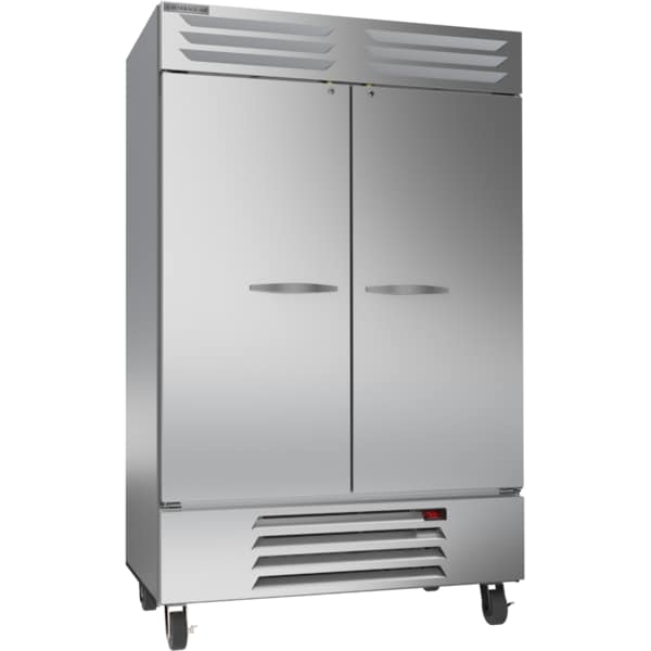 Refrigerator, Reach-in, Two Section, 46.15 cu. ft., Electronic Control, (2) Lockable Hinged Self Closing Solid Doors, (6) Wire Shelves, LED Lighting, Gray Painted Interior, Stainless Steel Front, Gray Coated Steel Sides, Bottom Mounted Self Contained Refrigeration, R290 Hydrocarbon Refrigerant, 1/3 HP Compressor, cULus, UL EPH Classified, UL-Sanitation