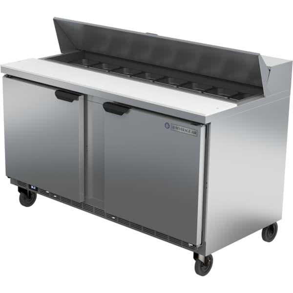 Refrigerated Sandwich Prep Table, 2 Door, 16.02 cu. Ft, 115 Volt, Two Section, 60"W, 45"H, Stainless Steel Top with Opening for (16) 1/6 Size Pans, 10" Cutting Board, (4) Shelves, Stainless Steel Exterior Top, Front, Sides & Doors, Galvanized Steel Exterior Bottom and Back, Aluminum Interior, Rear Mounted Self Contained Refrigeration, Pans Furnished are 4" Deep, Tops will Accommodate 6" Deep Pans, R-290 Hydrocarbon Refrigerant, cULus, UL EPH Classified, UL-Sanitation