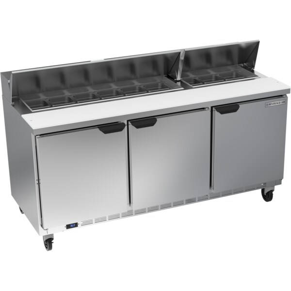 Refrigerated Sandwich Prep Table, 3 Door, 21.5 cu. Ft, 115 Volt, Three Section, 72"W, 45"H, 21.5 cu. ft. Capacity, (3) Doors, Stainless Steel Top with Opening for (18) 1/6 Size Pans, 10" Cutting Board, (6) Shelves, Stainless Steel Exterior Top, Front, Sides & Doors, Galvanized Steel Exterior Bottom and Back, Aluminum Interior, Rear Mounted Self-Contained Refrigeration, Pans Furnished are 4" Deep, Tops will Accommodate 6" Deep Pans, R-290 Hydrocarbon Refrigerant, UL EPH Classified, UL-Sanitation