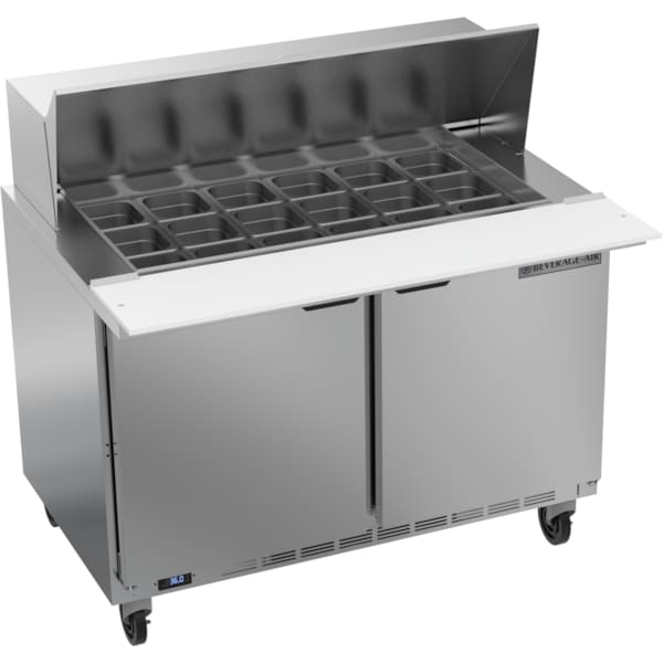 Refrigerated Sandwich Prep Table, Mega Top, 2 Door, 13.9 cu. Ft, 115 Volt, Two Section, 48"W, 49"H, 13.01 cu. ft., (2) Doors, Stainless Steel Top with Opening for (18) 1/6 size Pans, 10" Cutting Board, (4) Shelves, Stainless Steel Exterior, Aluminum Interior, Pans Furnished are 4" Deep, Tops will Accommodate 6" Deep Pans, R-290 Hydrocarbon Refrigerant, cULus, UL EPH Classified, UL-Sanitation