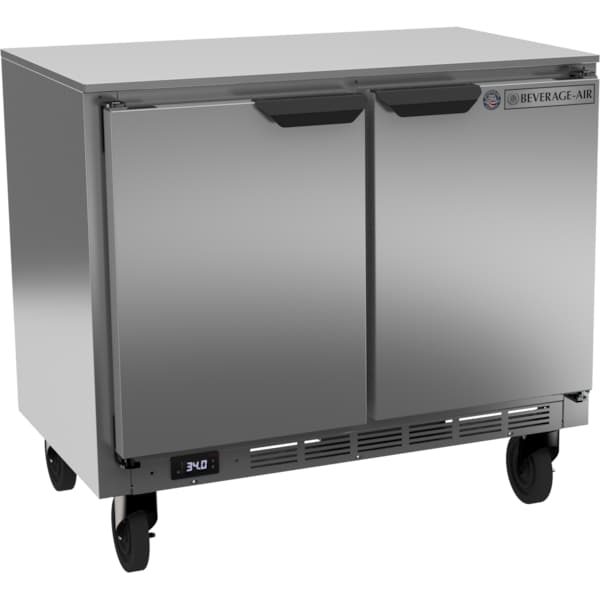 Refrigerator, Undercounter, Shallow Depth, 34" W, 5.96 cu. ft., 115 Volt, Stainless Steel Front, Sides, Top, Door, Galvanized Steel Back & Bottom, Interior Liner is Made of Corrosion Resistant Aluminum, Shallow Depth, Full Electronic Control, Undercounter Feature a 1/2” Thick Sub Top, Interior Thermometer is Standard, Self Closing Door with 120 ̊ Stay Open Feature, on cartridge Style Hinges, Painted Aluminum Door Handle, 6” Casters, Two with Brakes Standard, Four Epoxy Coated Steel Wire Shelves