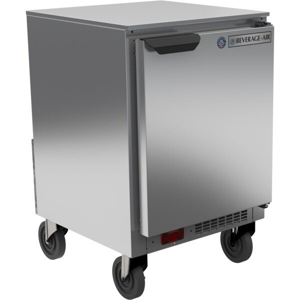 Refrigerator, Undercounter, Shallow Depth 20" W, 2.7 cu. ft., 115 Volt, Stainless Steel Front, Sides, Top, Door, Galvanized Steel Back & Bottom, Interior Liner is Made of Corrosion Resistant Aluminum, Shallow Depth, Full Electronic Control, Undercounter Feature a 1/2” Thick Sub Top, Interior Thermometer is Standard, Self Closing Door with 120 ̊ Stay Open Feature, on cartridge Style Hinges, Painted Aluminum Door Handle, 6” Casters, Two with Brakes Standard, Two Epoxy Coated Steel Wire Shelves, Field Reversible Door