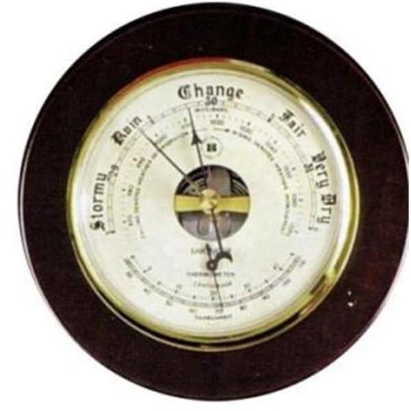 Bey-Berk specializes in fine office and home accessories. With everything from sand-timers to desk accessories Bey-Berk s products are the prefect compliment to your decor.The gorgeous open face of the Osprey Barometer/Thermometer makes weather assessment easy. Perched on a sumptuous cherry wood base the French precision barometer is lined with solid tarnish-proof brass. The color of brass deepened by the rich wood is an ideal border to the warm white face and classic black script. The center-most section of the face is cut away for a peek at the intricate internal mechanisms. The barometer scale runs along the top of the piece while the thermometer is placed below and indicates both Fahrenheit and Celsius temperatures.